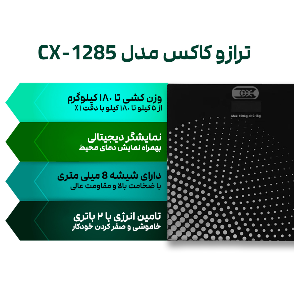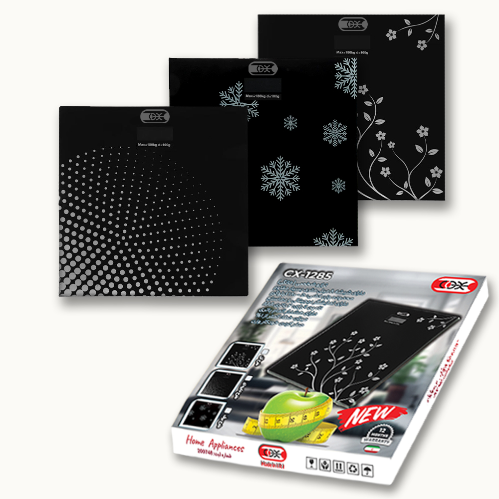 ترازوی دیجیتال کاکس مدل CX-1285 با طراحی زیبا و شیشه نشکن ضخیم ساخته شده که هم ظاهر شیکی دارد و هم مقاومت بالایی در برابر استفاده روزمره نشان میدهد.