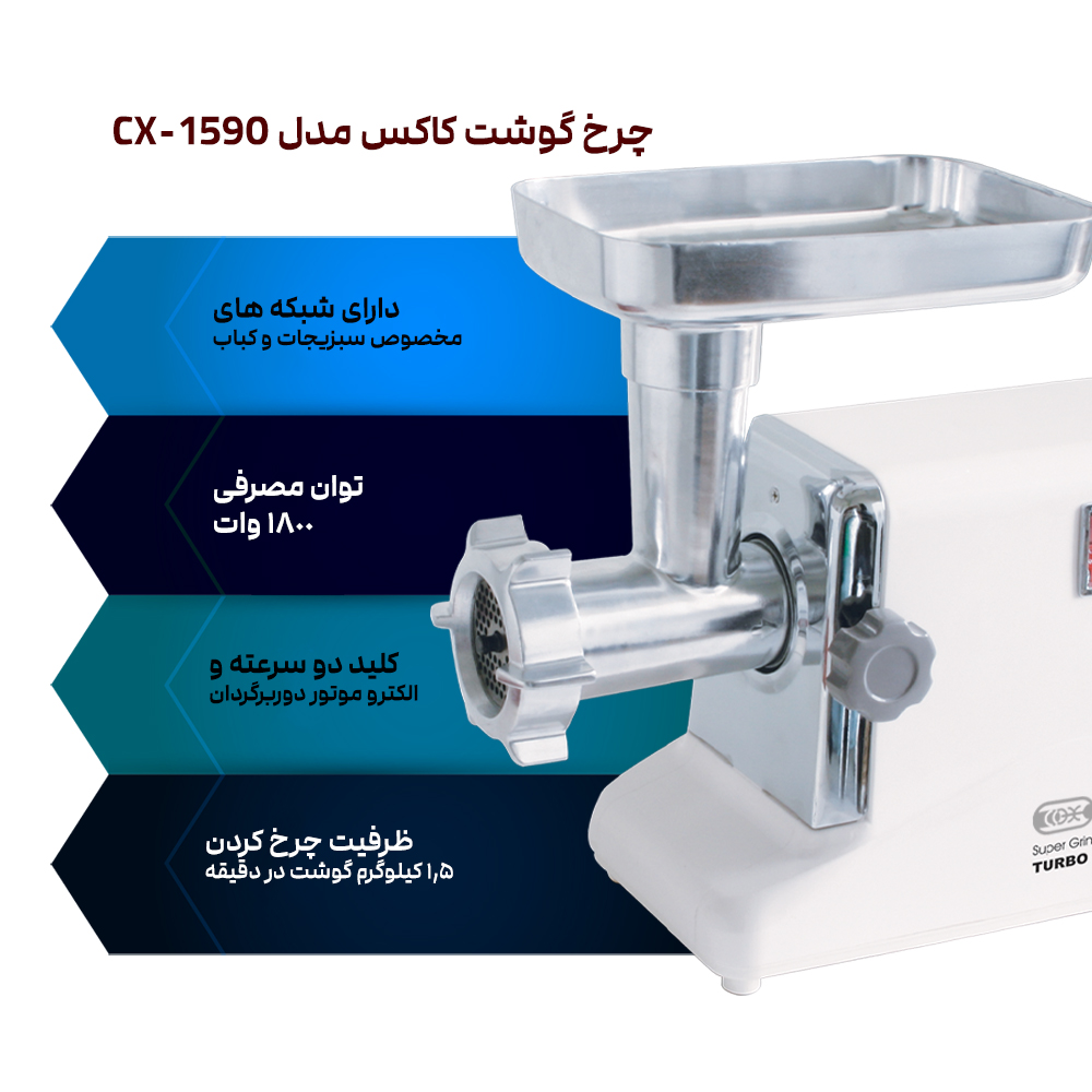 چرخگوشت کاکس مدل CX-1590 یک دستگاه قدرتمند و همهکاره برای آشپزخانه شماست.